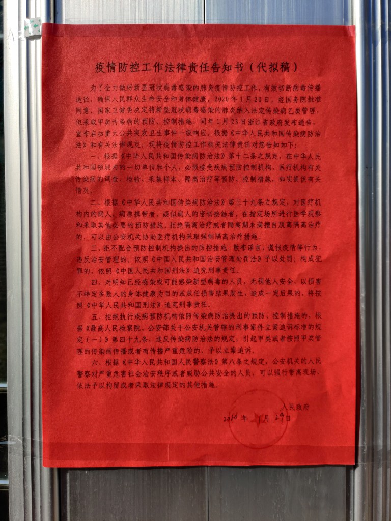 然后我就坐车回家了嘛,结果到了我家,可能就过了两天(笑),就说现在疫情是浙江非常严重、大家要小心从浙江出来的人员。于是我们又中招了嘛,我记得回我家之后就又被上门贴封条了。(笑)