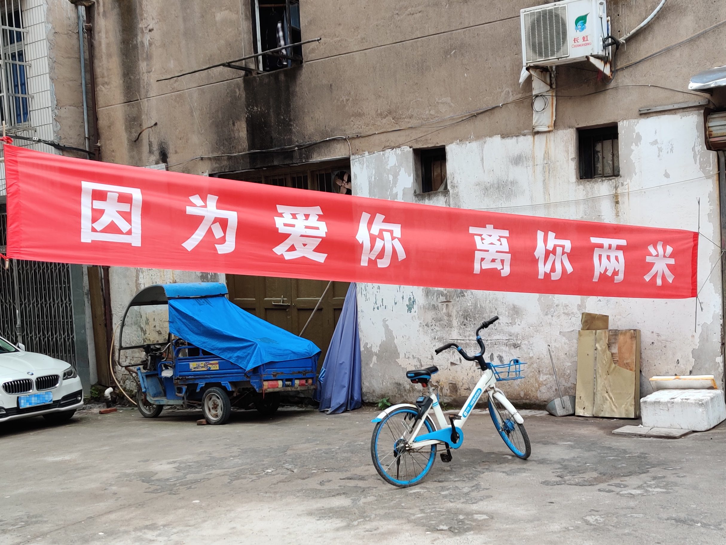 然后我记得就是我们社区负责我们的那个小姑娘,她自己开车把我们送回家的嘛,一路上就听到她一直在抱怨。她说上面的政策要求也是一天一个样子,就是今天说要这样了,明天就要改掉。她说她每天做得最多的事情就是在那边挂横幅——(笑)就是疫情期间那些标语的横幅。她说挂了一个又一个,有些挂好了然后过了几天要改了、又有新的了,她还要跑过去再把它拿下来。因为她人不是很高,所以她说挂横幅对她来讲还蛮痛苦的——就是她每次要在那边够来够去的,她说她觉得蛮烦的。反正就是抱怨了一通吧,我当时就觉得她们也非常不容易。